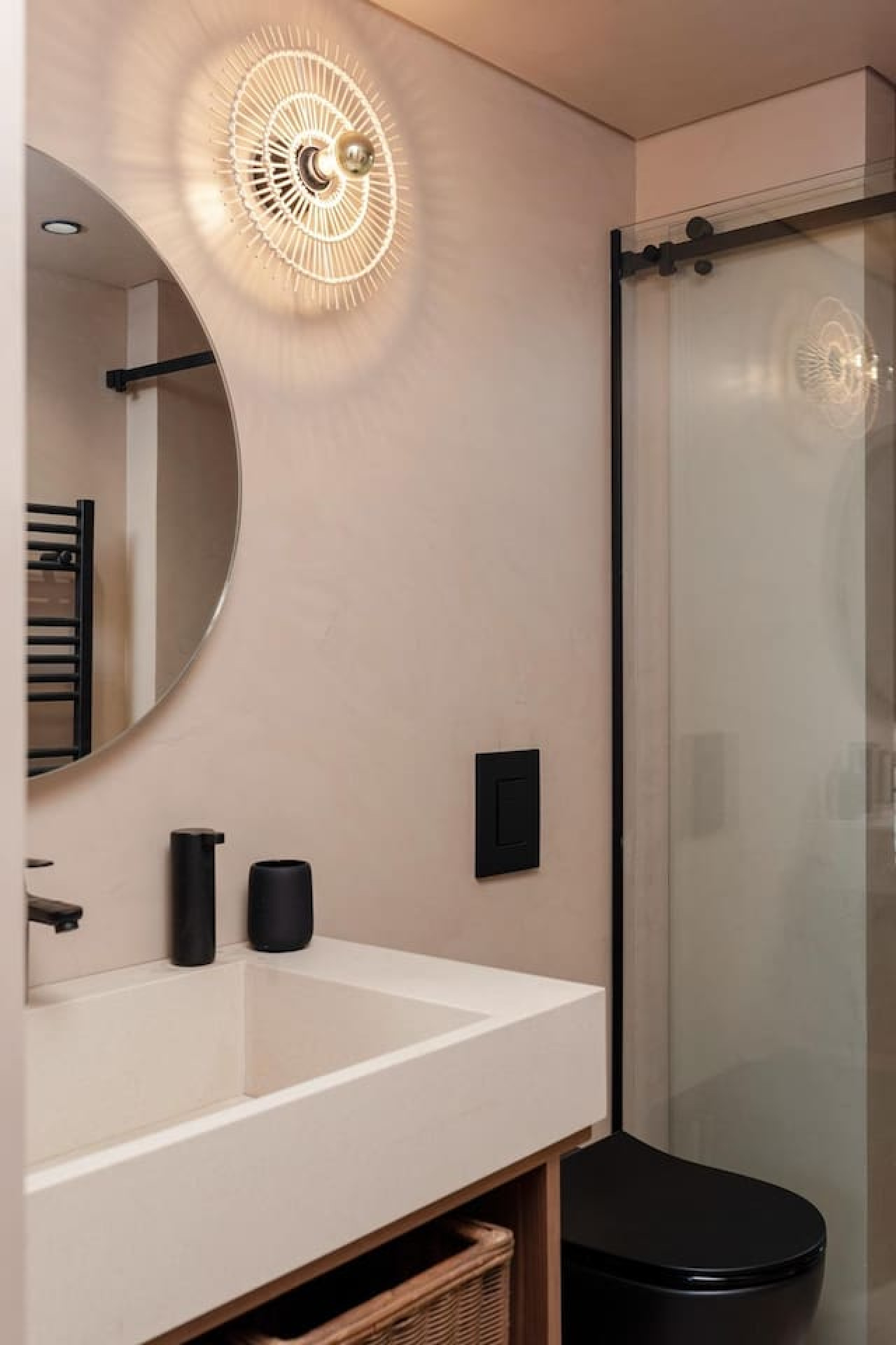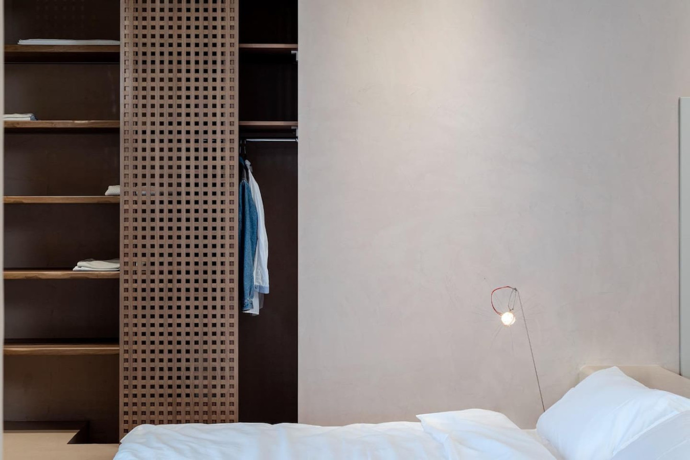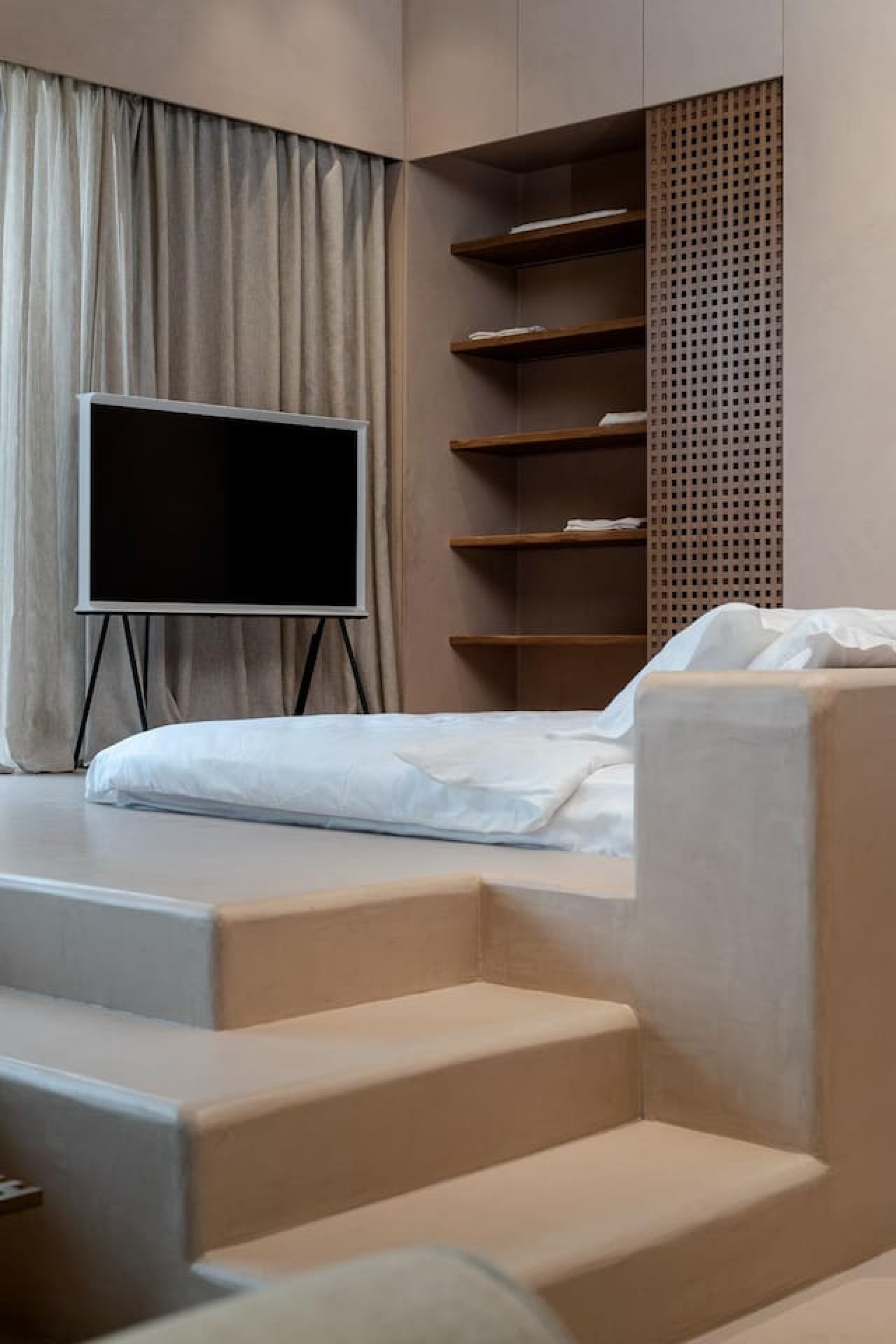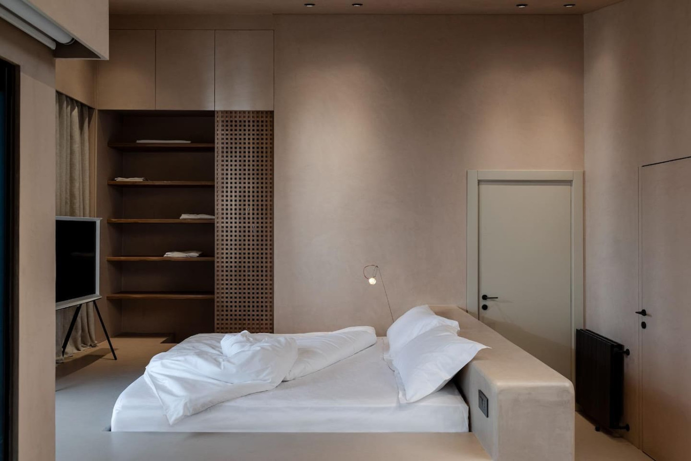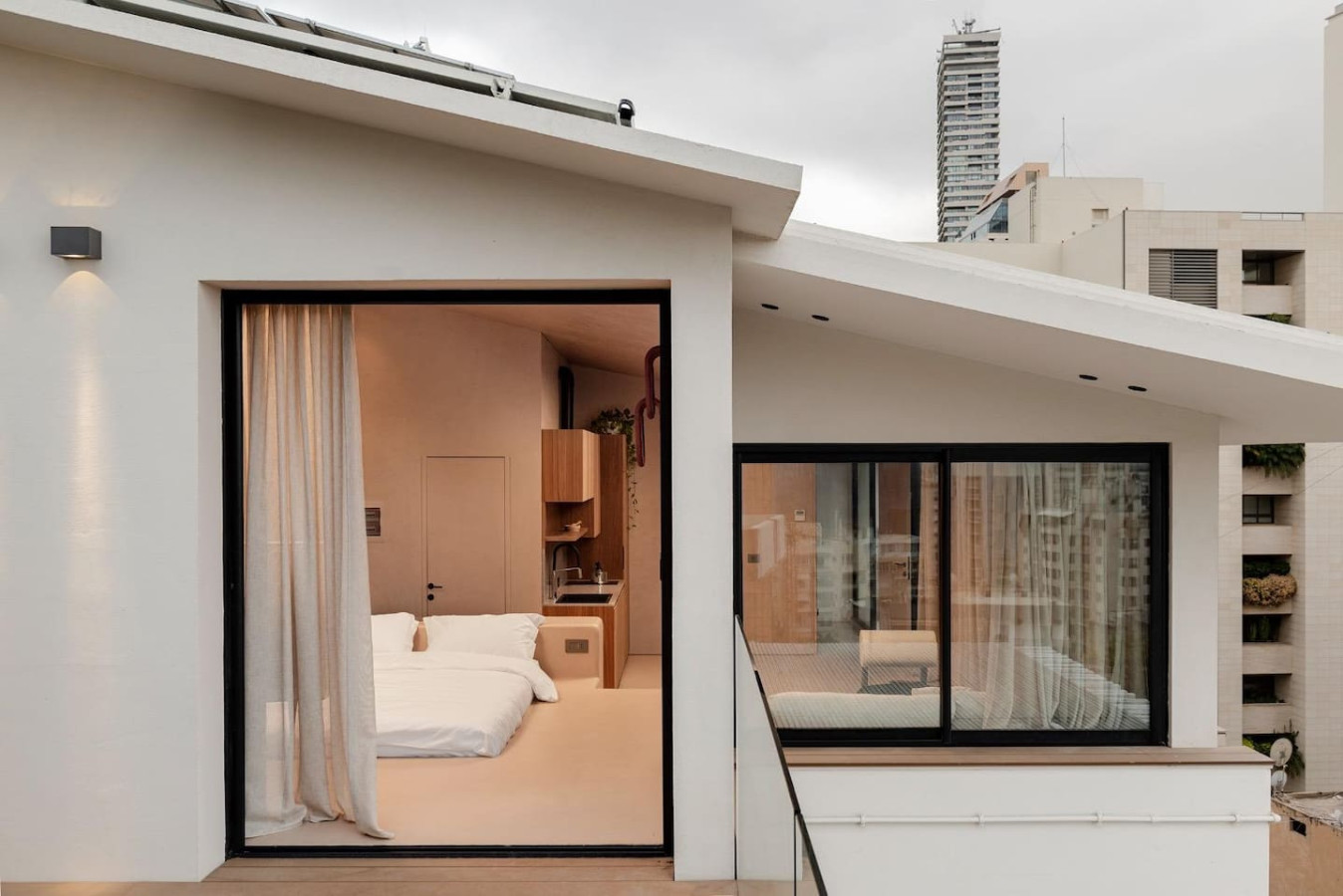 Architect’s Loft Rooftop A minimalist masterclass in the heart of Achrafieh. This rooftop studio features hand-applied micro-cement, fluted wood, and a unique elevated platform bed. Every detail is intentional. The space opens onto a private terrace, offering a rare outdoor escape above Beirut’s most prestigious streets. Clean lines, organic textures, and total privacy